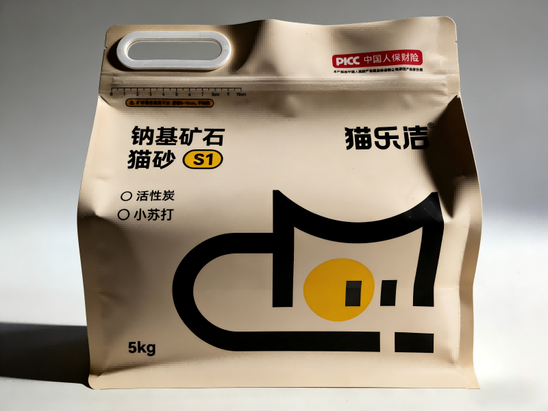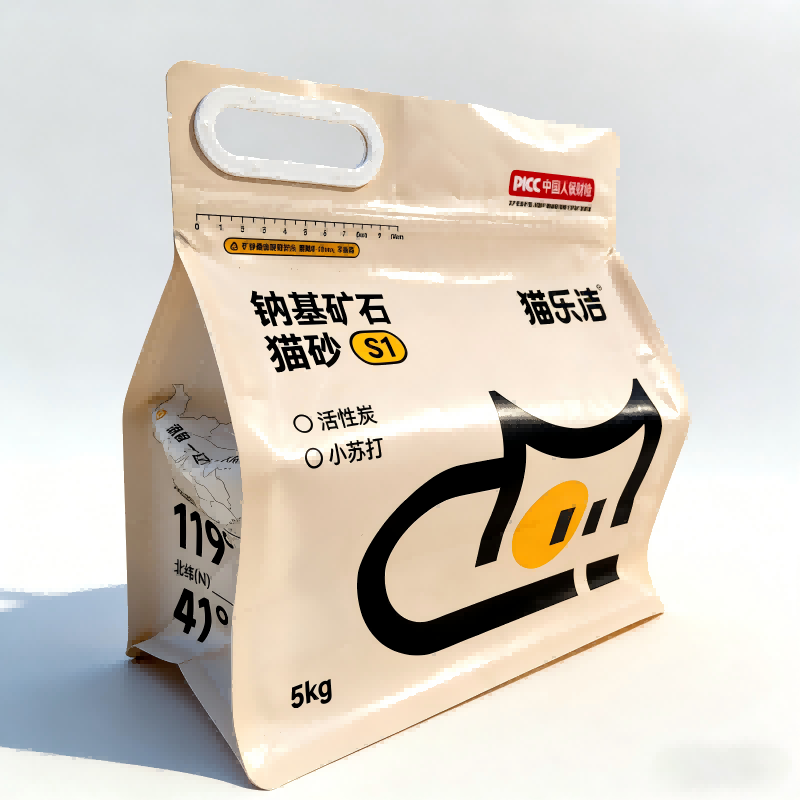 Pinapanatili ng eight-sided sealing structure ang bag na matatag at patayo, perpekto para sa mga kilalang shelf display. Pinapadali din nito ang matatag na stacking at maginhawang imbakan. Ang hawakan ng zipper ay nagbibigay ng ligtas at maaasahang selyo, na pumipigil sa pagpasok ng kahalumigmigan at alikabok kahit na paulit-ulit na pagbubukas at pagsasara. Higit pa rito, ang reinforced plastic handle na disenyo ay nagbibigay-daan para sa madaling paghawak ng 5kg ng cat litter, na nagpapahusay sa karanasan ng user.